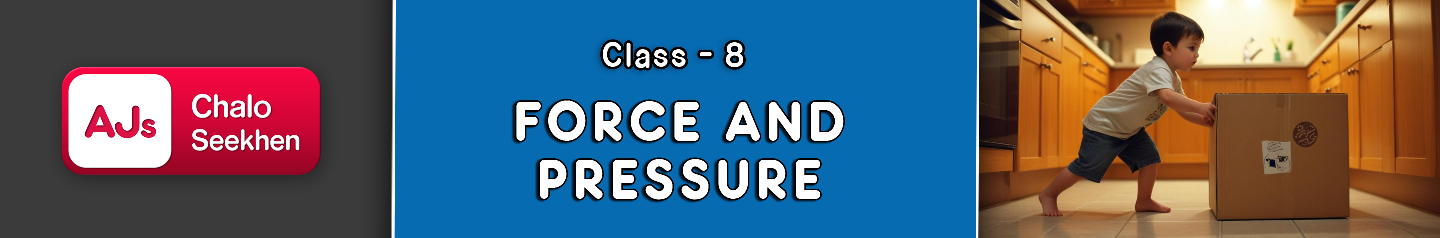 Welcome to AJs Chalo Seekhen. This webpage is dedicated to Class 8 | Science | Chapter 8 - Force and Pressure. The chapter delves into the fundamental concepts of force and pressure. It explains that a force is a push or pull that can change the state of motion or shape of an object. The chapter covers different types of forces, including contact forces like muscular and frictional forces, and non-contact forces such as gravitational and magnetic forces. It also explores the concept of pressure, defined as force per unit area, and discusses how pressure is exerted by liquids and gases. Understanding these principles is crucial for grasping more complex scientific concepts later on.